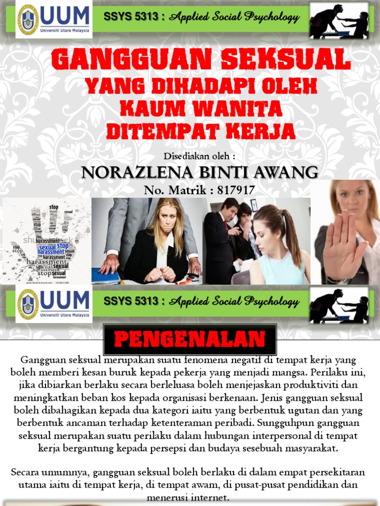 Kes gangguan seksual di malaysia berada di tahap yang membimbangkan. Undangundang gangguan seksual di malaysia, universiti utara malaysia, bisnes dan pengurusan. Beberapa lagi wanita tampil di twitter berkongsi pengalaman mereka diganggu secara seksual semasa bersekolah. Dr siti aisyah saintis wanita lonjakkan imej malaysia. Jika mereka terlalu pendiam, pastikan anda selalu. Sebuah psa mengenai gangguan seksual di tempat kerja. Ia boleh beri kesan negatif pada mangsa. Jurnal pendidikan universiti teknologi malaysia. Gangguan seksual merupakan perbuatan seksual yang bukan berlandaskan sukarela mangsa kepada golongan yang dominan di tempat kerja. Selalunya kita mendengar berita gangguan seksual dilakukan oleh lelaki terhadap wanita di tempat kerja. Sentiasa bertanyakan guru dan ambil tahu cara anak bergaul di sekolah. Di malaysia, gangguan seksual di teinpat kerja berlaku tetapi sejauh mana dan berapa serius masalah ini berlaku belum dapat ditentukan. Di samping itu, gangguan seksual bukan sahaja terjadi di kalangan pekerja wanita sahaja, tetapi sebanyak 15% daripada kes yang dilaporkan melibatkan kaum lelaki.